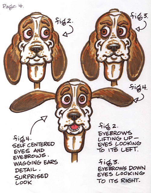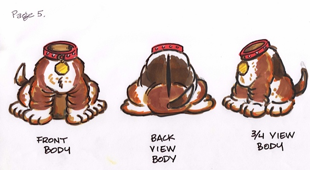 Alex Howell, famed illustrator and friend to many vents, did the initial drawings. Goal was for a friendly Basset Hound figure, with very BIG eyes. Desired animations were large flapping ears, moving eyebrows, self centering eyes, and moving mouth.